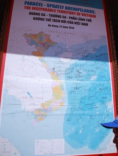 Các học giả quốc tế và Việt Nam cùng ký lên tấm bản đồ thể hiện chủ quyền của Việt Nam đối với Hoàng Sa-Trường Sa. LÊ PHI.