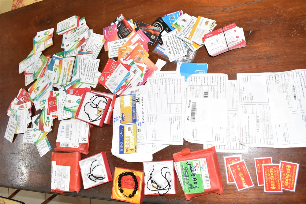 Lực lượng Công an thu giữ 10 bộ máy tính, 11 điện thoại di động, nhiều gói bưu phẩm đựng sim điện thoại, hơn 1000 thẻ sim điện thoại và sim data 128, cùng nhiều vật dụng là thẻ bùa, giấy chứng nhận công đức, vật phẩm phong thủy.
