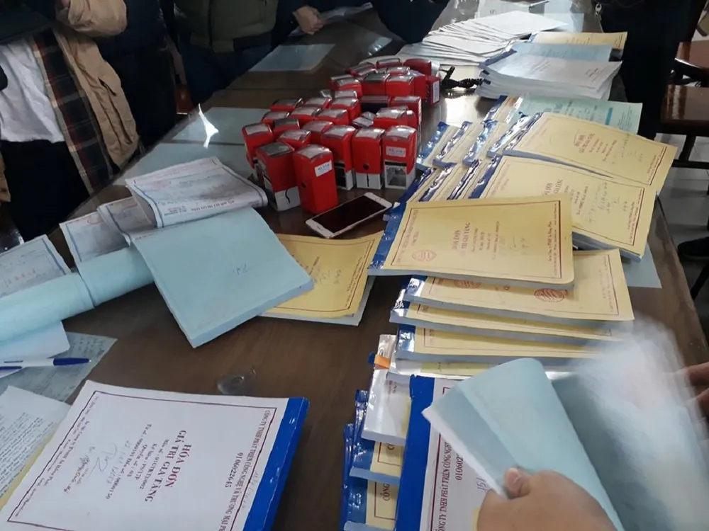 Cơ quan điều tra tiến hành khám xét bốn địa điểm liên quan và thu giữ nhiều con dấu, hóa đơn, tài liệu để tổ chức bán trái phép hóa đơn GTGT.