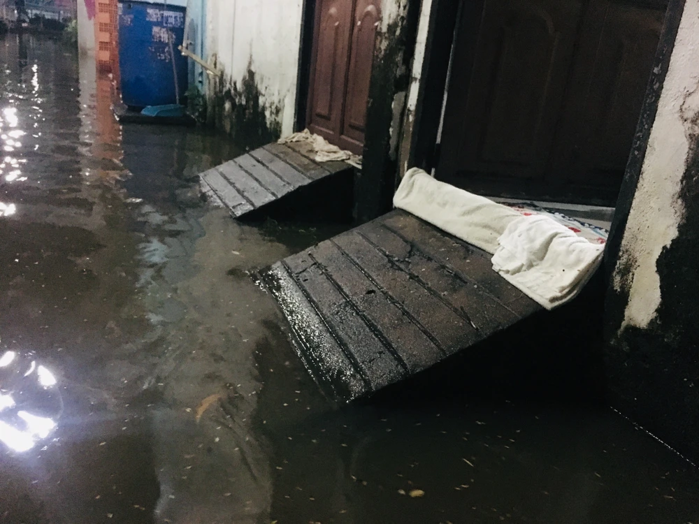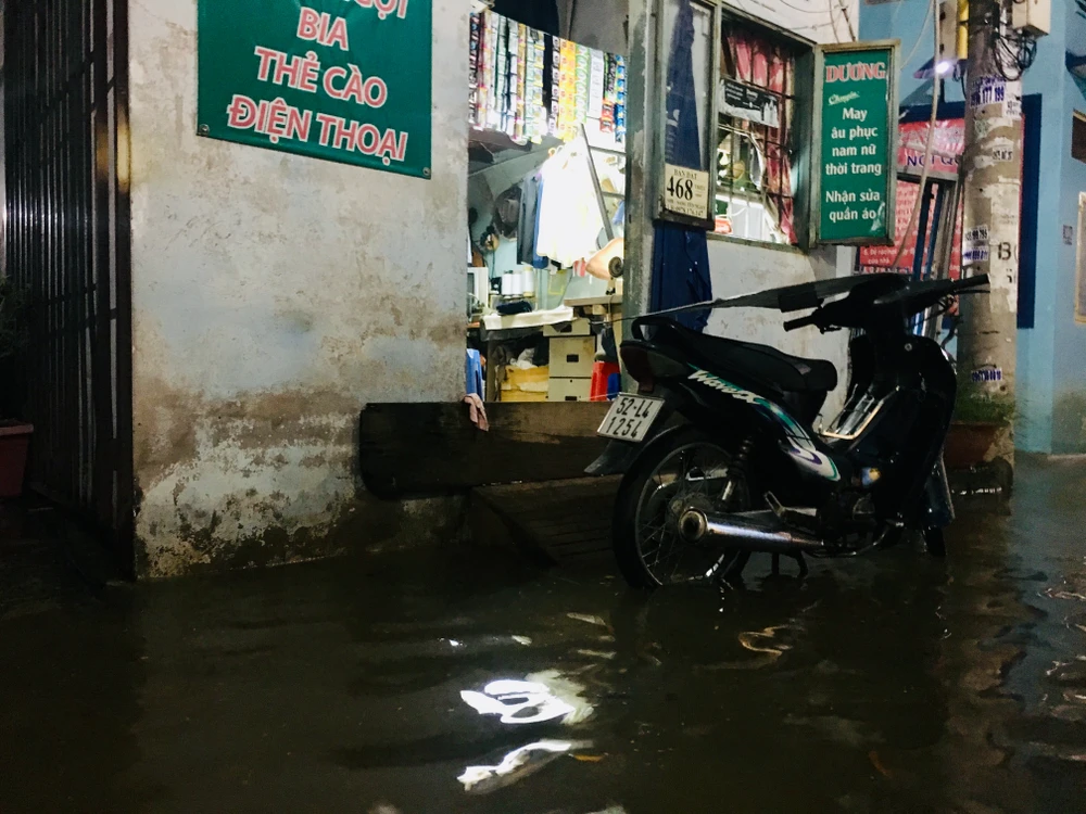 Vào hẻm 149 (Bình Quới, Bình Thạnh), nước ngập tới nửa bánh xe, có đoạn ngập tới gần đầu gối. Nhiều gia đình phải dùng khăn, chăn, gạch, ván… chèn cửa ngăn nước tràn vào nhà.