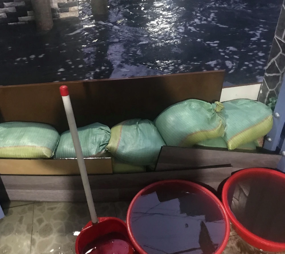 Sự cố cộng triều cường khiến nước ngập lênh láng trên khu vực, nhiều hộ dân đã chủ động che chắn bằng bao cát nhưng nước vẫn tràn vào nhà. Người dân cho biết, lúc nước lớn ngập khoảng 1 m, trẻ con phải đi gửi nhà hàng xóm có nền cao.