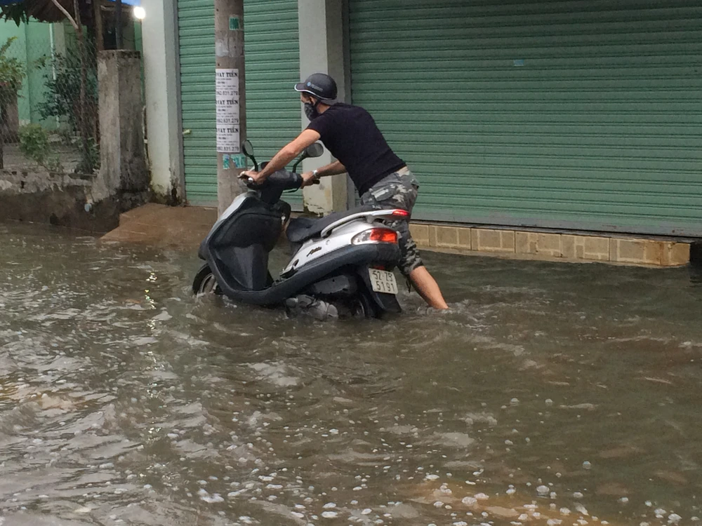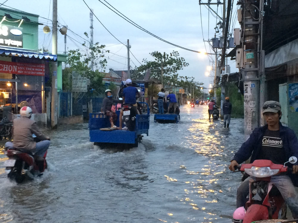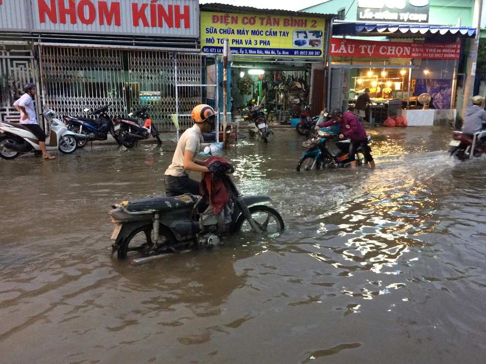 Tối 20-12, mặc dù triều cường lên không quá cao nhưng tuyến đường Lê Văn Lương, huyện Nhà Bè, TP.HCM vẫn bị ngập nặng, có nơi ngập hơn nửa mét.