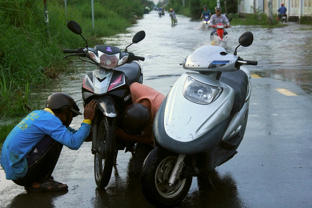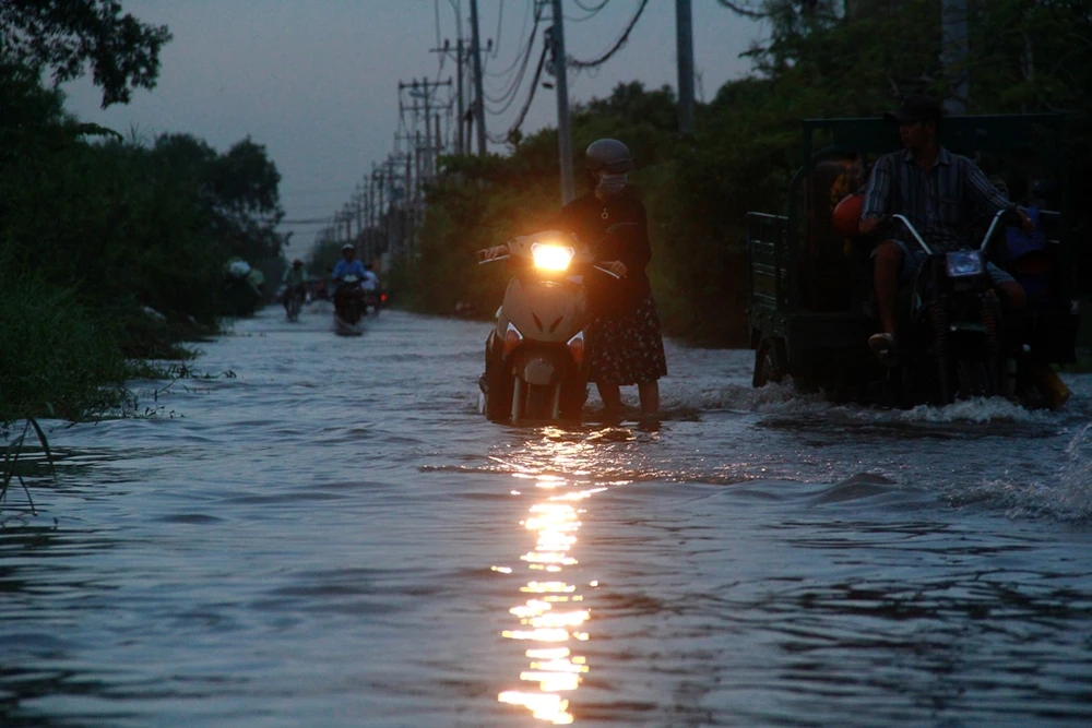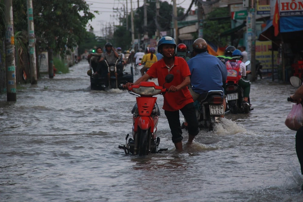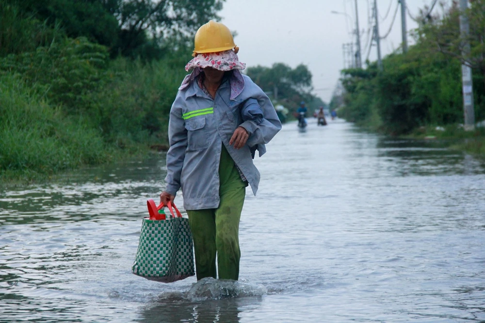 Chiều 7-11, trên đường Lê Văn Lương đoạn qua xã Nhơn Đức, huyện Nhà Bè (TP.HCM) ngập sâu do triều cường. Người dân phải xếp hàng dài suốt nhiều giờ chờ nước rút hoặc dắt xe qua đoạn nước cao để về nhà.