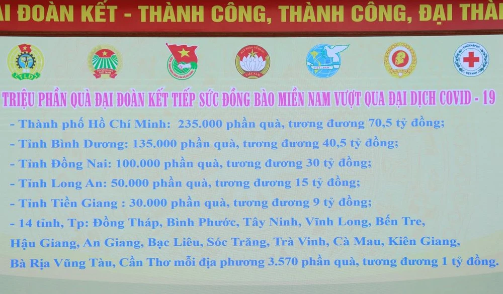 Ngay hôm nay, chương trình sẽ hỗ trợ cho TP. Hồ Chí Minh và các tỉnh phía Nam đang thực hiện giãn cách xã hội tổng số 600.000 phần quà (tương đương 180 tỉ đồng) cho các địa phương như TP HCM, Bình Dương, Đồng Nai, Long An, Tiền Giang cùng với 14 tỉnh, thành phố khác ở miền Nam.