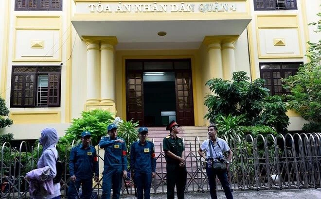 Bên ngoài trụ sở TAND, quận 4 lực lượng cảnh sát, dân phòng được huy động chốt chặn hai đầu và phía trước cổng tòa án để đảm bảo an ninh cho phiên xử.