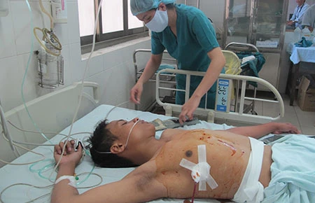 Cú đâm sâu khiến em Thông bị tràn dịch tim, phổi, gan, mất nhiều máu. Ảnh: TẤN LỘC