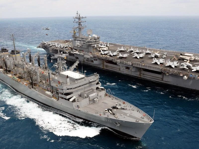 Tàu sân bay hạt nhân USS Ronald Reagan di chuyển cùng tàu hộ tống. Hiện tàu sân bay này đang tập trận tại vùng biển phía Đông bán đảo Triều Tiên.