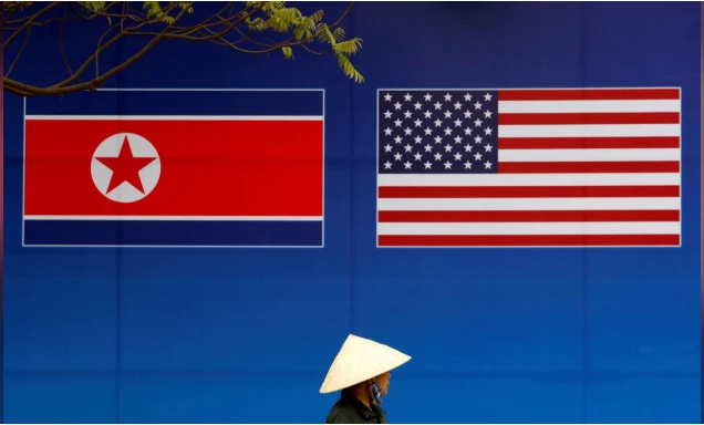Một banner thể hiện cờ Triều Tiên và cờ Mỹ (phải) tại hội nghị thượng đỉnh Mỹ-Triều lần hai ở Hà Nội hồi tháng 2. Ảnh: REUTERS