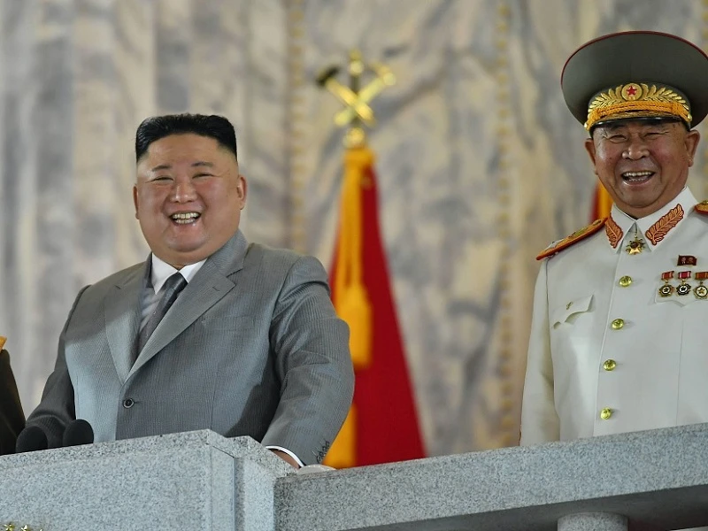 Ông Ri Pyong-chol (phải) và nhà lãnh đạo Triều Tiên Kim Jong-un (trái) trong lễ duyệt binh hồi tháng 10-2020. Ảnh: RODONG SINMUN