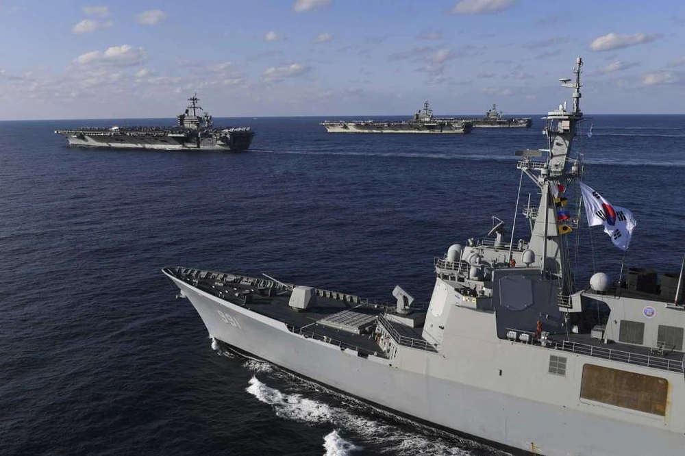 Tàu khu trục Hàn Quốc (phải) tham gia tập trận cùng ba đội tàu sân bay tác chiến của hải quân Mỹ. Ảnh: AP