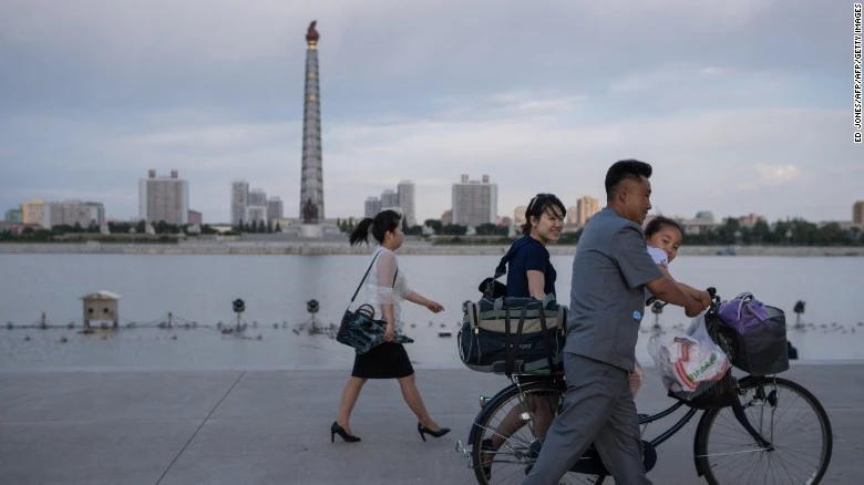 Người Triều Tiên thong thả đi tản bộ ở tháp Juche, Bình Nhưỡng. Ảnh: CNN