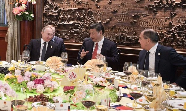 Tổng thống Nga Vladimir Putin, Chủ tịch Trung Quốc Tập Cận Bình và Ngoại trưởng Nga Sergey Lavrov (từ trái sang) tham dự bữa tiệc tại hội nghị thượng đỉnh "Một vành đai, một con đường" hôm 14-5. Ảnh: TASS