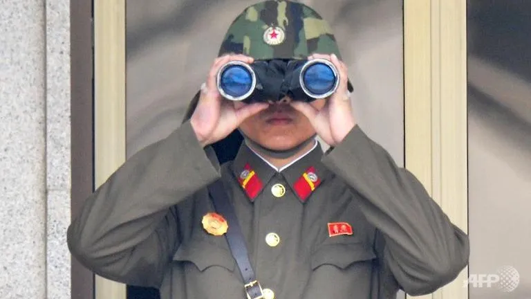 Một người lính Triều Tiên đang theo dõi ngôi làng đình chiến Panmunjom trong khu phi quân sự