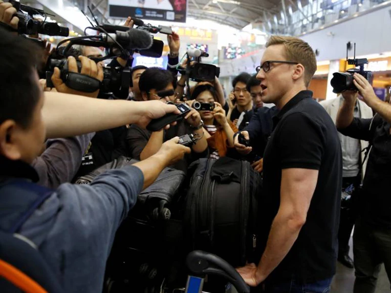 PV Will Repley của đài CNN trả lời truyền thông tại sân bay ở Bắc Kinh hôm 22-5 trước khi đến Triều Tiên. Ảnh: REUTERS