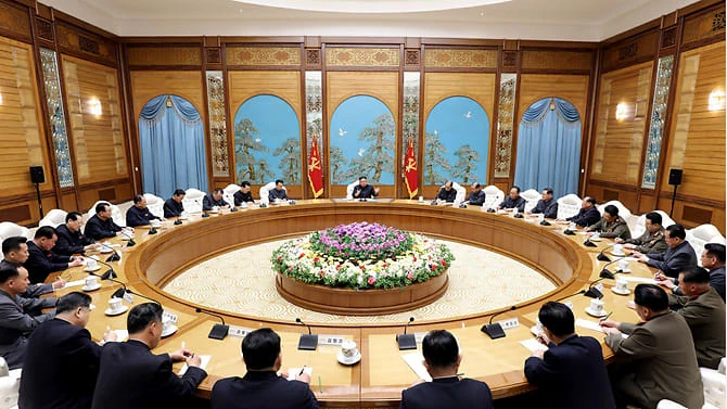 Nhà lãnh đạo Triều Tiên Kim Jong-un (giữa) chủ trì một cuộc họp của Bộ Chính trị nước này tại Bình Nhưỡng hôm 11-4. Ảnh: AFP