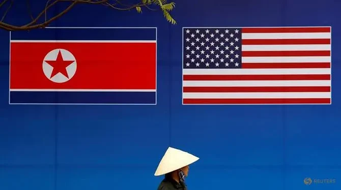 Hai lá cờ Mỹ và Triều Tiên được treo tại một con đường ở Hà Nội trong đợt hội nghị thượng đỉnh Mỹ-Triều năm 2019. Ảnh: REUTERS