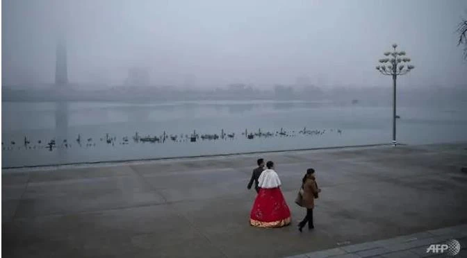 Một đôi tình nhân trong trang phục đồ cưới đi dọc sông Taedong ở thủ đô Bình Nhưỡng trong một chiều đầy sương. Ảnh: AFP