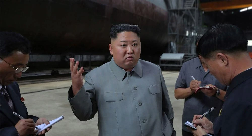 Nhà lãnh đạo Triều Tiên Kim Jong-un thị sát một tàu ngầm mới đóng tại một địa điểm bí mật ngày 23-7. Ảnh: AFP