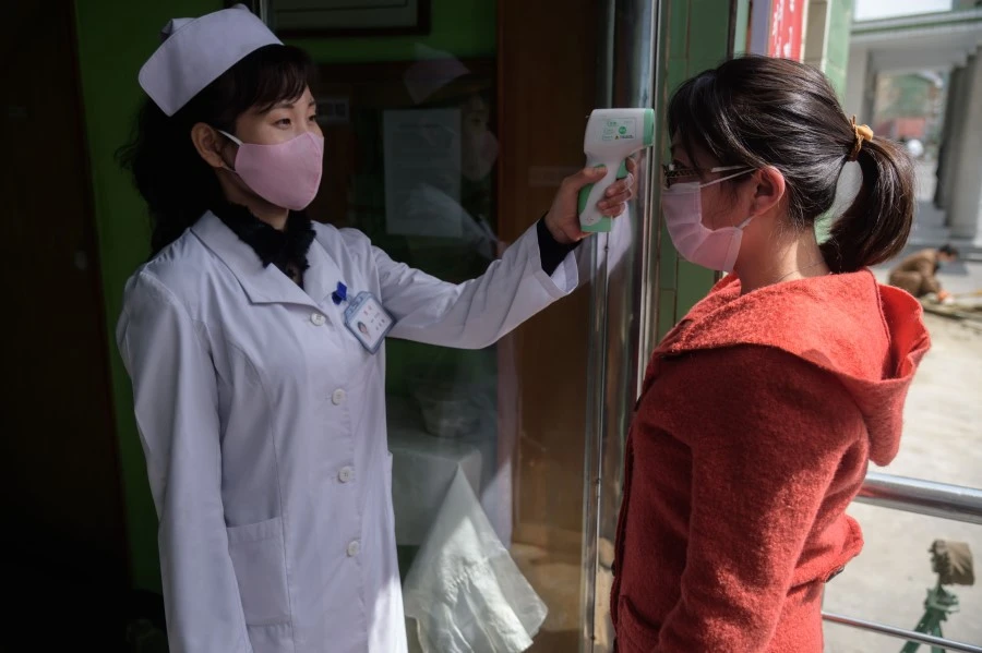 Nhân viên y tế tại thủ đô Bình Nhưỡng đo thân nhiệt người dân. Ảnh: Kim Won Jin/AFP
