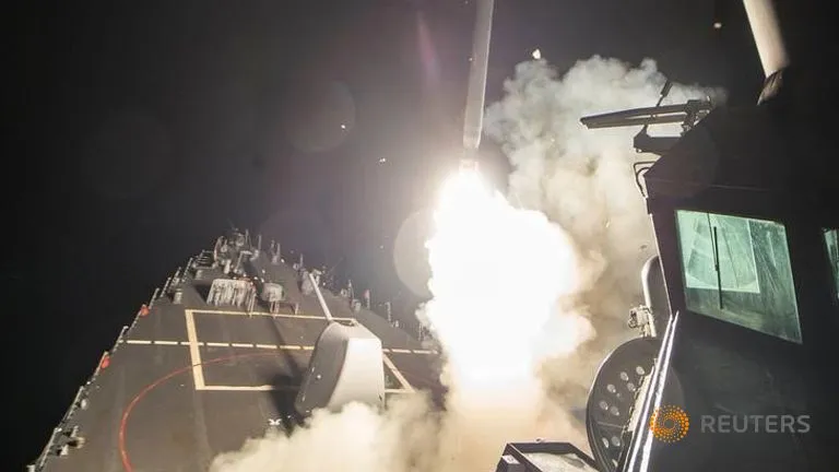 Một tên lửa hành trình Tomahawk được phóng từ một tàu chiến của Mỹ nhằm vào căn cứ ở Syria đêm 6-4 (giờ Mỹ). Ảnh: Reuters