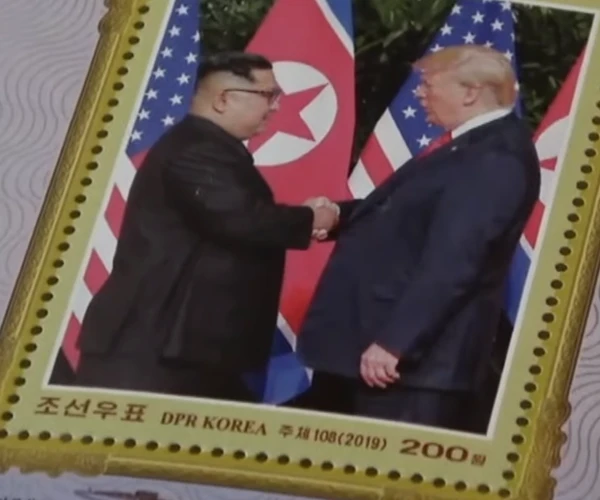 Một loạt tem in hình hai nhà lãnh đạo bắt tay nhau vừa được bán tại Bình Nhưỡng kể từ ngày 12-6, nhân kỷ niệm một năm ngày hội nghị thượng đỉnh đầu tiên giữa ông Kim Jong-un và Tổng thống Trump vào năm 2018.