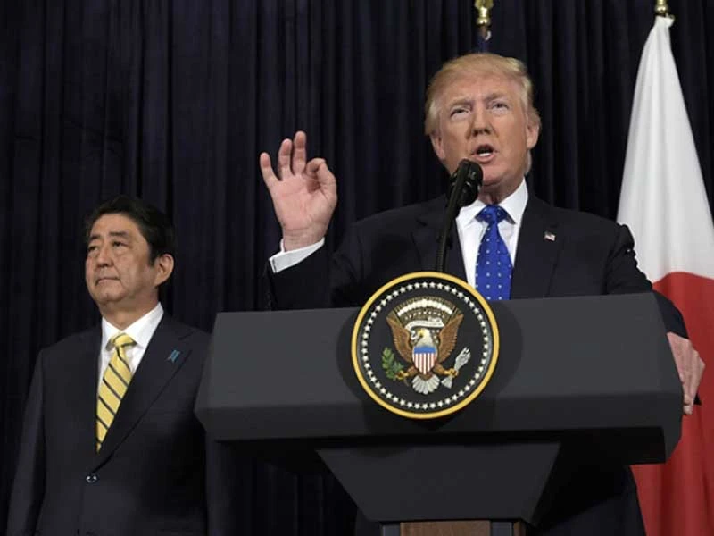 Tổng thống Mỹ Donald Trump và Thủ tướng Nhật Shinzo Abe phản ứng về vụ phóng tên lửa của Triều Tiên ngày 12-2 trong cuộc gặp tại Florida (Mỹ). Ảnh: AP