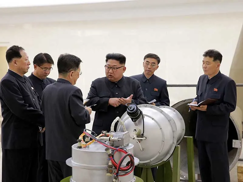 Ông Kim Jong-un đứng cạnh một đầu đạn hạt nhân. Hình ảnh được công bố ngày 3-9-2017, vài tiếng trước vụ thử hạt nhân lần thứ sáu của Triều Tiên. Ảnh: KCNA