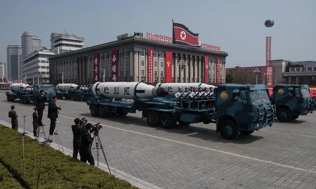 Triều Tiên trình diễn tên lửa trong lễ duyệt binh hôm 15-4. Ảnh: GETTY IMAGES