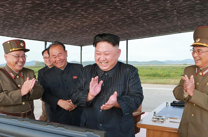 Lãnh đạo Triều Tiên Kim Jong-un vỗ tay sau vụ phóng tên lửa Hwasong-12 hôm 15-9. Ảnh: Yonhap