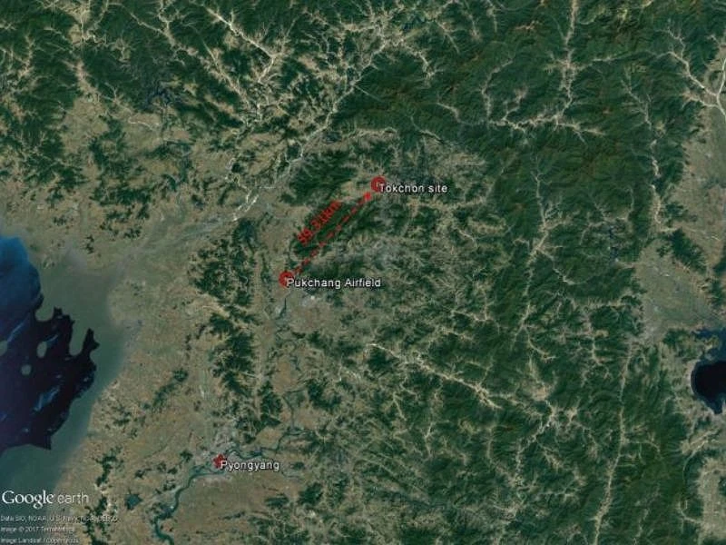 Khu vực Chongsin-dong ở TP Tokchon nằm cách sân bay Pukchang khoảng 39 km. Ảnh: DIPLOMAT/GOOGLE EARTH