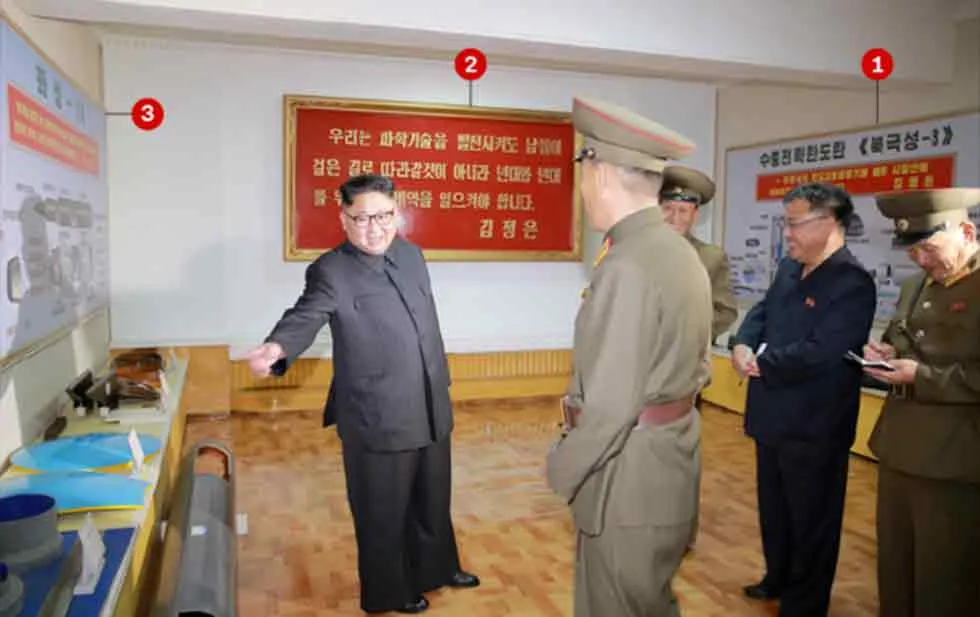 Bình Nhưỡng "vô tình" để lộ hình ảnh kế hoạch phát triển các mẫu tên lửa đạn đạo chưa từng thấy trước đây của nước này trên tường. Ảnh: KCNA