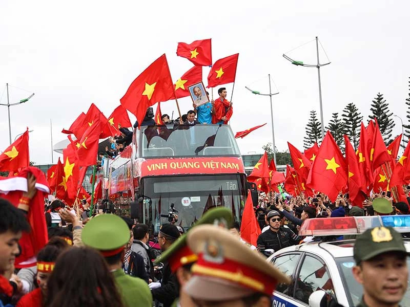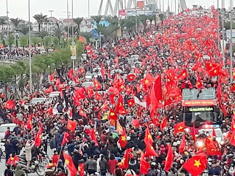 Trên các nẻo đường của thủ đô hôm qua, người hâm mộ kết thành từng dòng người dài mãi không ngớt. Đứng từ trên cao nhìn xuống, dòng người như những dòng sông đỏ hô vang các khẩu hiệu: Việt Nam vô địch! Việt Nam! Việt Nam! Việt Nam!