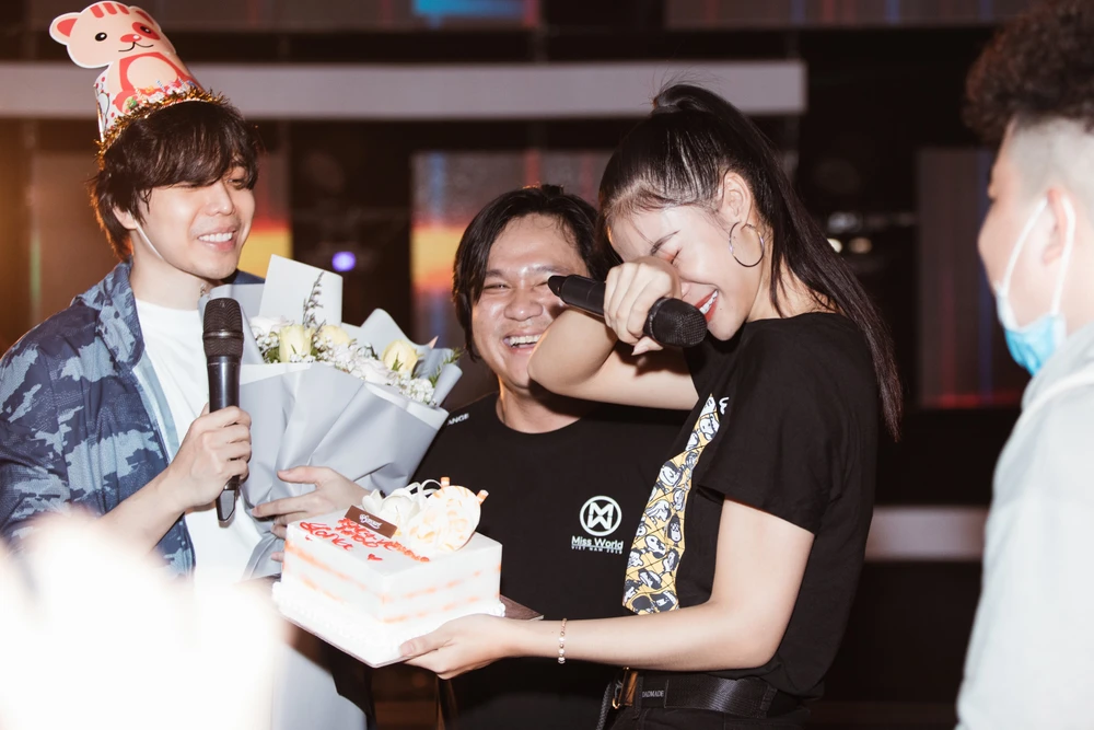 Chiếc bánh kem và bó hoa tươi thắm trên tay anh đã khiến cô nàng bật khóc vì quá bất ngờ, chưa kịp hoàn hồn lại thì trên màn hình xuất hiện clip những người bạn là những hoa hậu, á hậu thân thiết của Kiều Loan cùng huấn luyện viên Trịnh Thăng Bình gửi lời chúc tốt đẹp nhất tới cô nhân ngày sinh nhật.