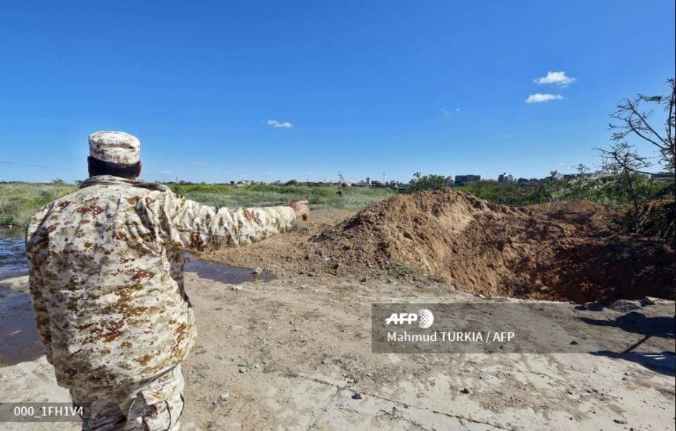 Một hố bom ở sân bay Mitiga sau khi hứng không kích từ lực lượng LNA. Ảnh: AFP