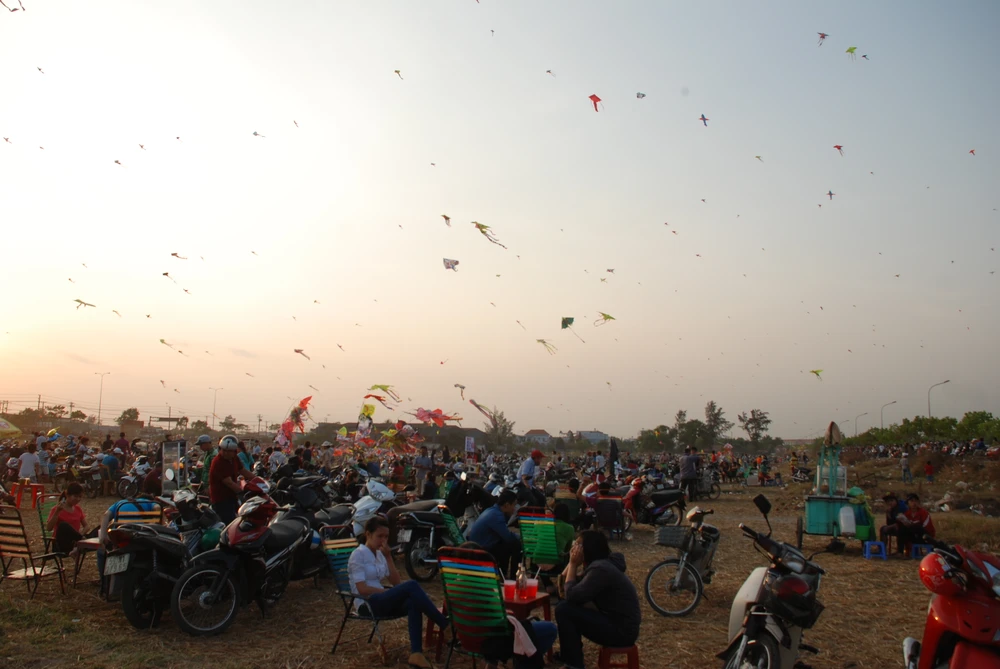 Những con diều lớn 3-4 người thả vẫn đang tung bay trên bầu trời .