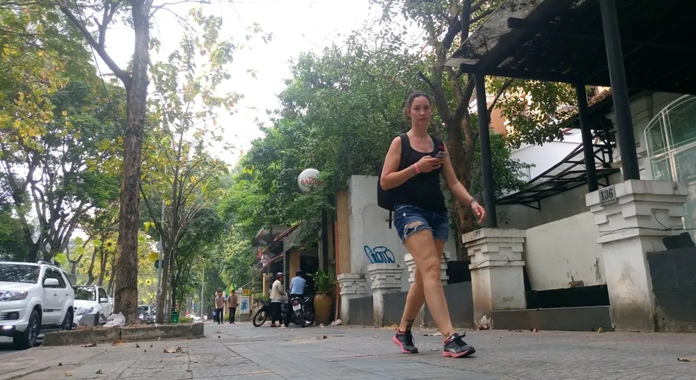 Người đi bộ trên trên vỉa hè trước Trung tâm Bồi dưỡng Chính trị quận 1 chiều 3-3.