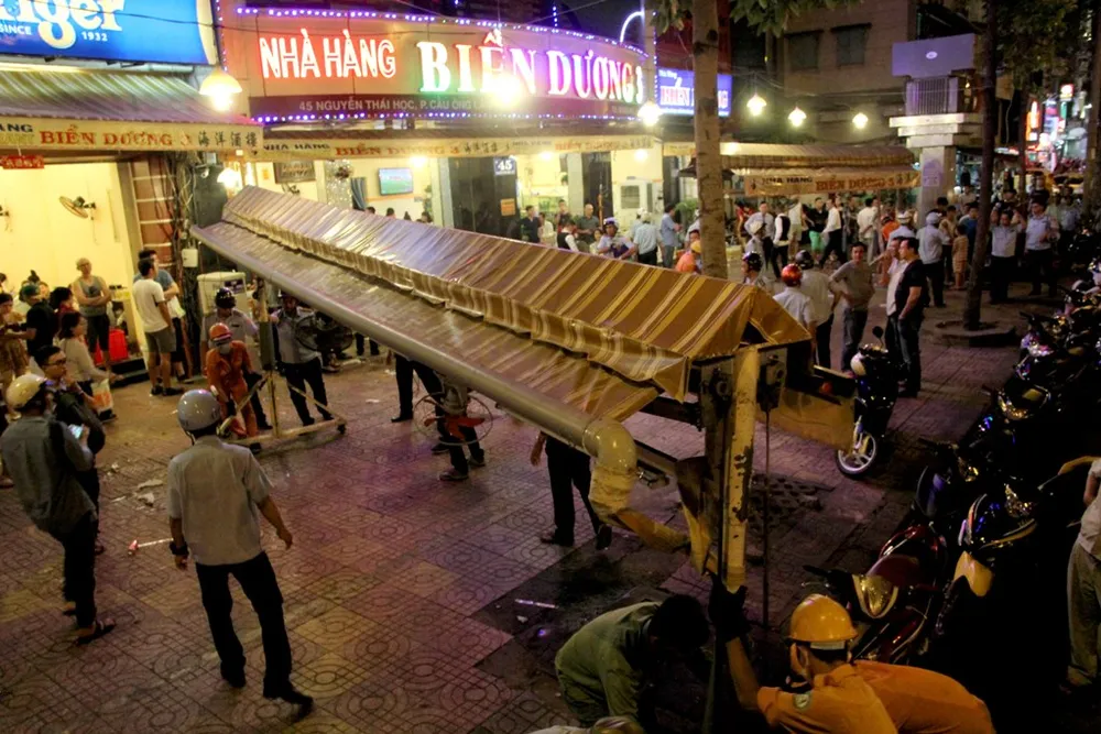 Nhà hàng Biển Dương trên đường Nguyễn Thái Học bị đoàn kiểm tra tịch thu bàn ghế, mái che chiếm vỉa hè.