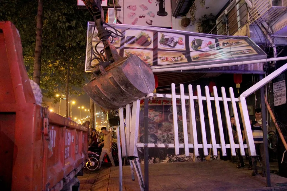 Hàng rào lấn chiếm vỉa hè trên đường Nguyễn Thái Học bị cẩu ngay trong đêm.