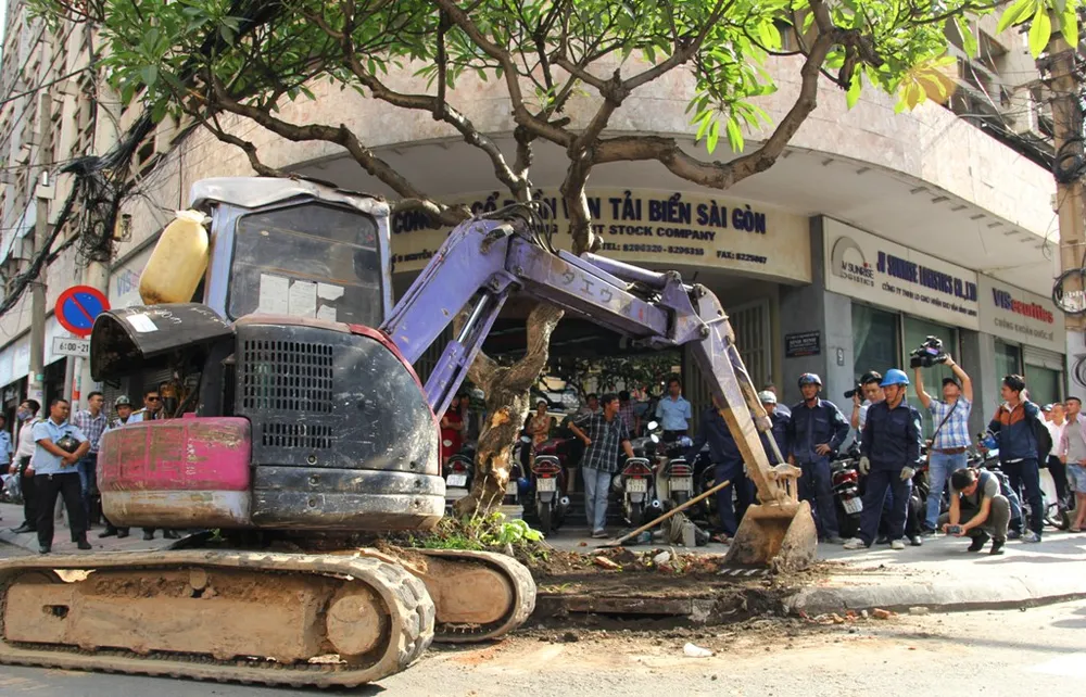 Bồn cây xây dựng trái phép, lấn chiếm vỉa hè trước trụ sở Công ty Vận tải biển Sài Gòn bị phá bỏ ngày 27-2.