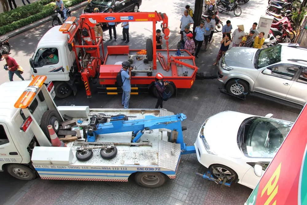 Hai xe biển xanh bị lập biên bản cẩu xe trước một quán nhậu trên đường Nam Kỳ Khởi Nghĩa.