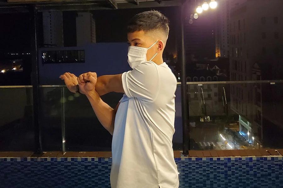 Một F0 tại TP.HCM tập thể dục tại nhà để tăng cường sức đề kháng. Ảnh: NVCC