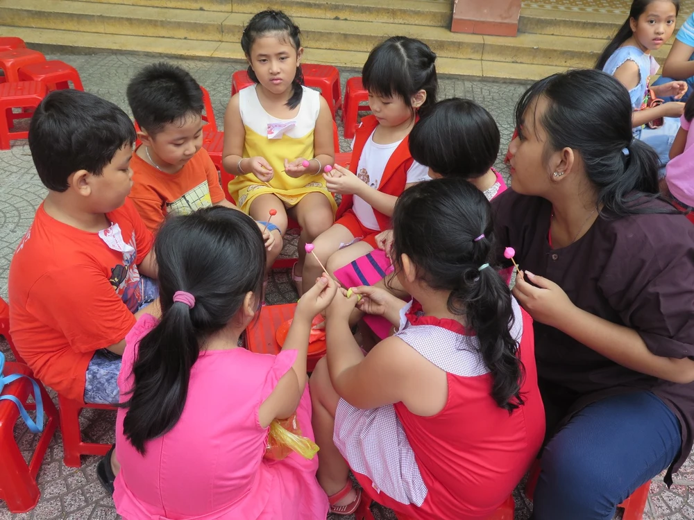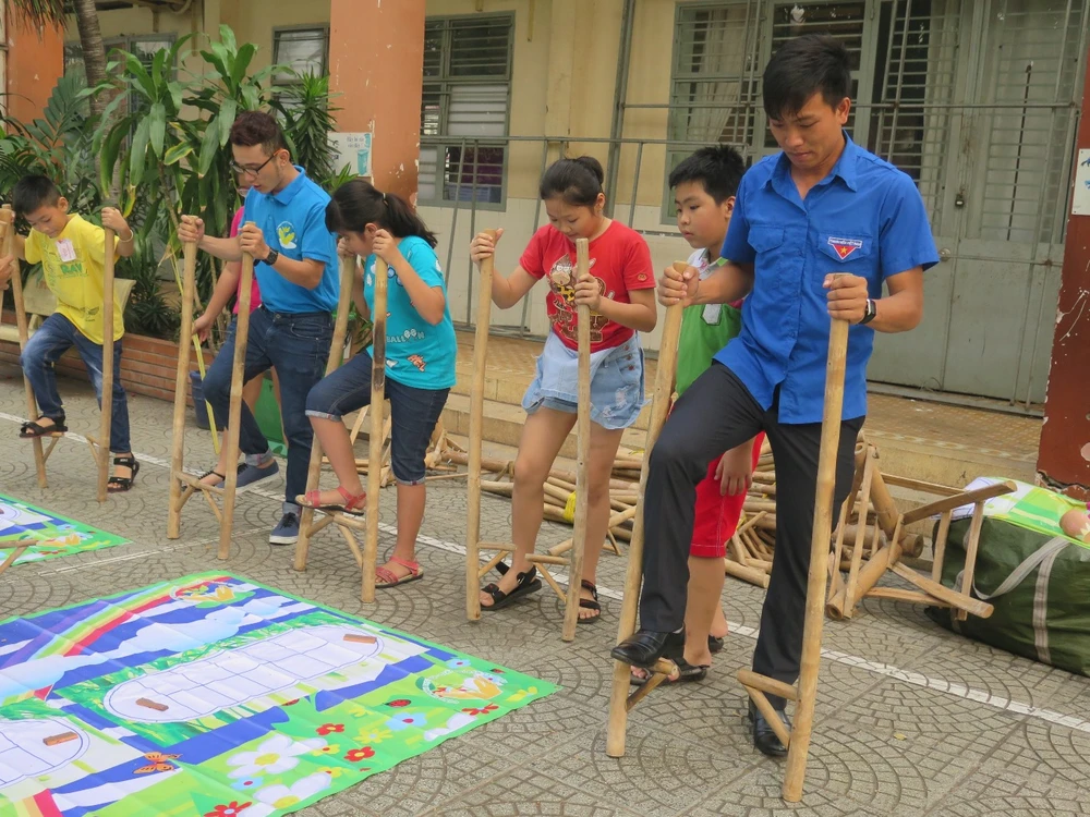 Các anh chị tình nguyện viên hướng dẫn các em đi cà kheo, một trò chơi dân gian rất quen thuộc từ xa xưa.