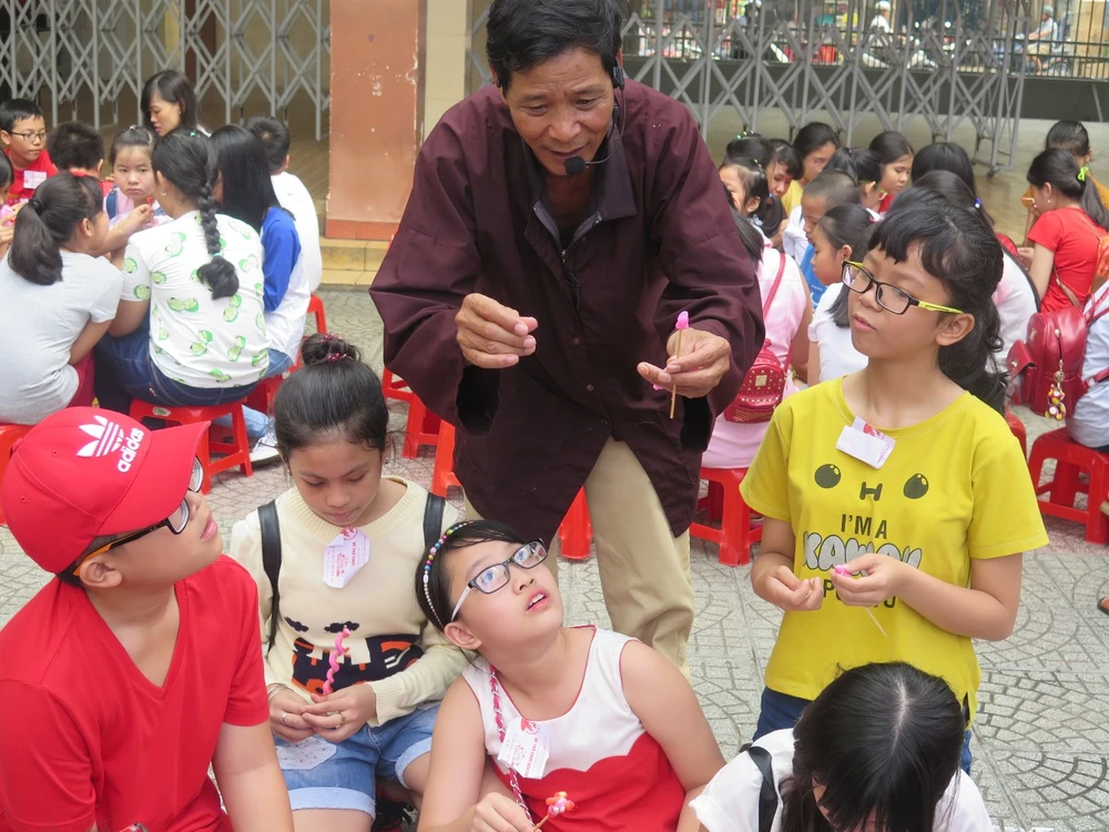 Chú nghệ nhân đang hướng dẫn các em nặn tò he.