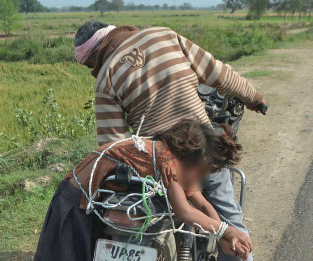 Đứa bé gái đã được hứa cho kẹo và quà, nhưng cô bé vẫn một mực từ chối. Người cha đã giận dữ trói đứa bé vào ghế sau của xe máy bằng dây thừng và đưa cô bé đến trường.