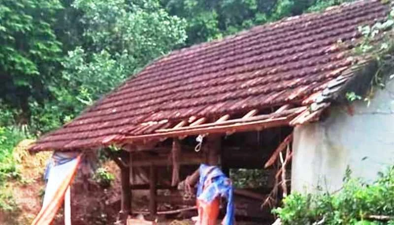 Mái ngói chuồng bò của mẹ con chị Bình bị sét đánh vỡ ngói, hư hỏng.