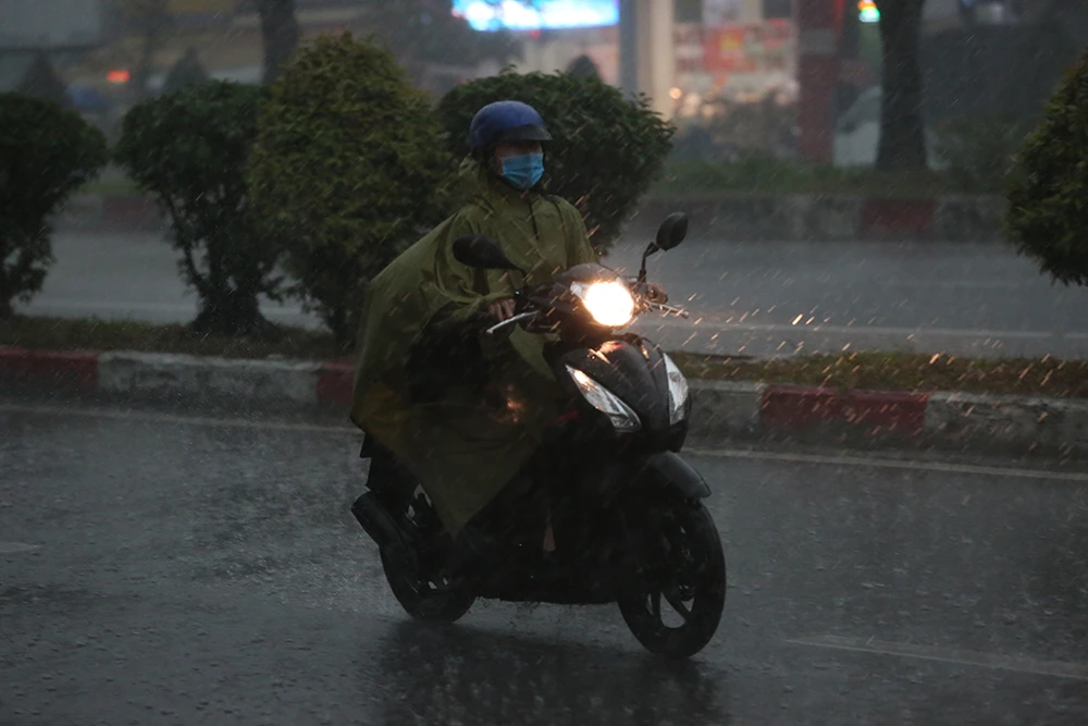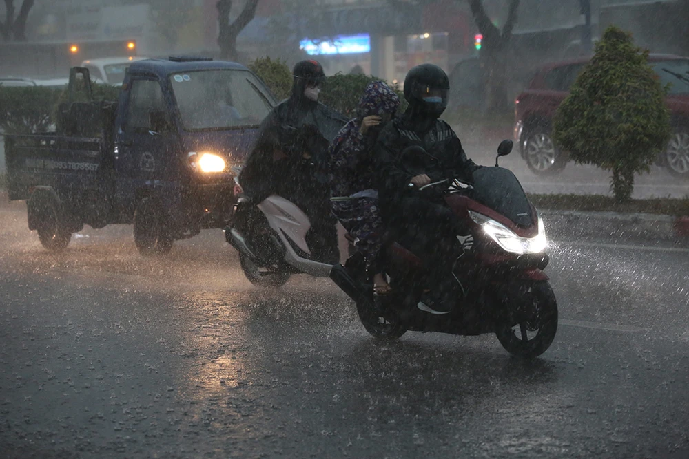 Mưa đổ xuống nặng hạt, trời tối đến mức các phương tiện phải bật đèn để lưu thông.