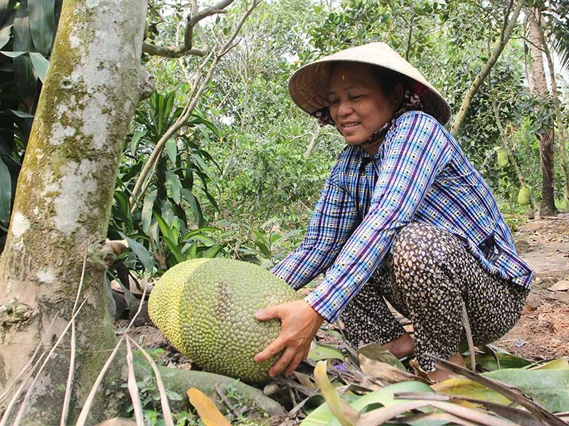 Chị Nguyễn Kim Dũ cạnh trái mít vừa thu hoạch. Ảnh: T.GIANG