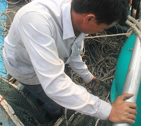 Theo anh Hoàng, tàu anh bị trộm lấy khoen và chì. Không để ý nên ra khơi đánh bắt, khi thả lưới thì những chỗ bị cắt rơi xuống biển mất luôn.
