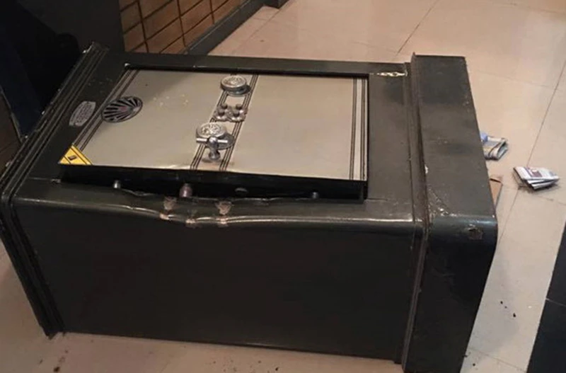 Chiếc két sắt bị trộm đục tung nhưng không phát hiện 25.000 USD trong ngăn bí mật.