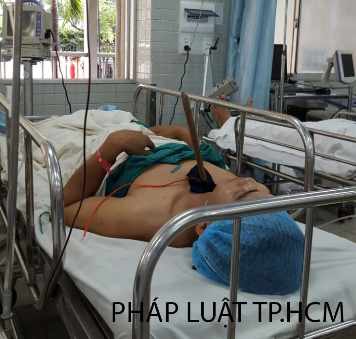 Bệnh nhân Bùi Thiện Thắng và mũi tên ngay dưới cổ đang chờ được phẫu thuật trong bệnh viện. Ảnh: DUY TÍNH.